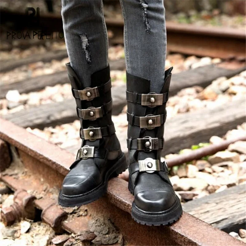 Kopen Goedkoop Prova Perfetto Zwart Punk Stijl Vrouwen Motorlaarzen Bandjes Terug Rits Mid kalf Winter Laarzen Vrouwelijke Platform Botas Militares Online