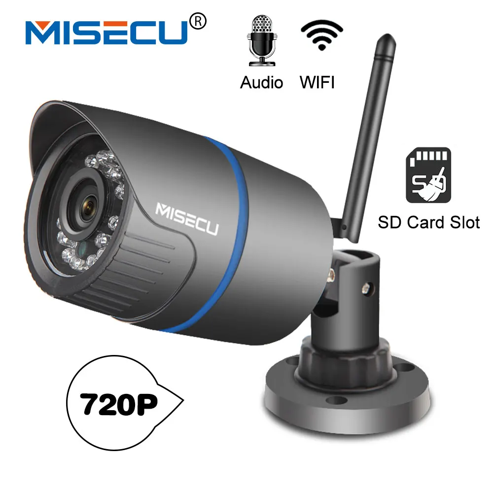 Goede Kopen MISECU H.264 + Wifi camera Audio gebouwd sd kaart 2.8mm Wifi 1280*720 p P2P ONVIF Draadloze e mail alert nachtzicht IR Outdoor CCTV Goedkoop