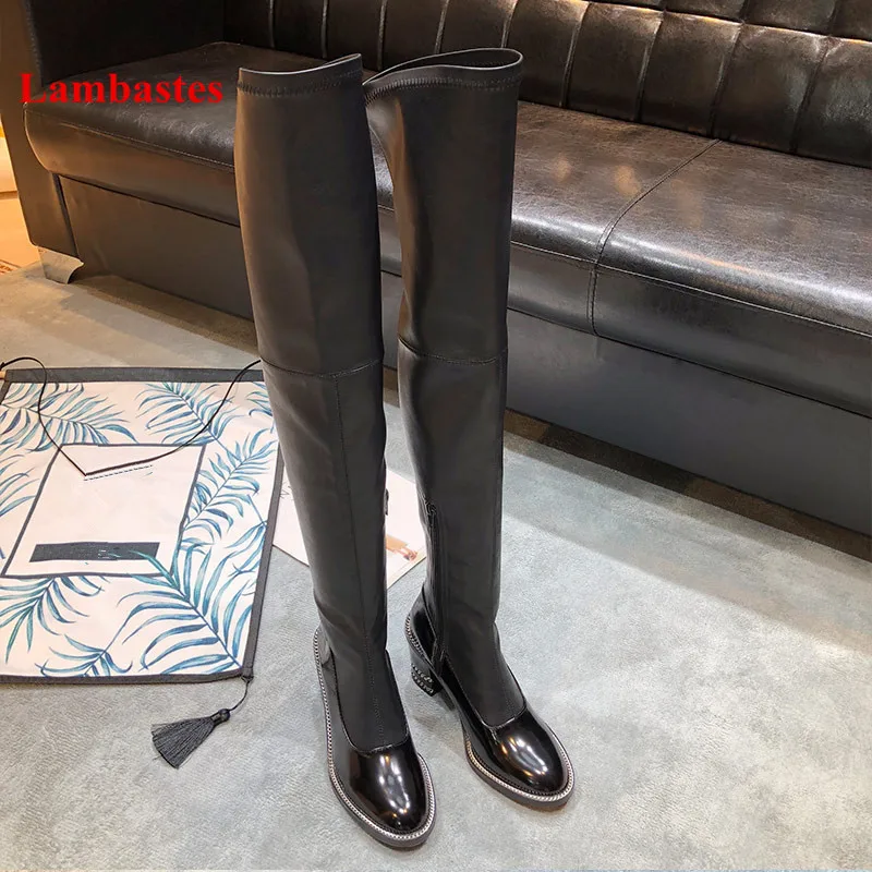 Goede Koop 2018 Winter Over de Knie Vrouwen Laarzen Zwarte Ketting Brand Design Zip Up Laarzen Lederen Dikke Hoge Hak lange Martin Botas Femenina Goedkoop
