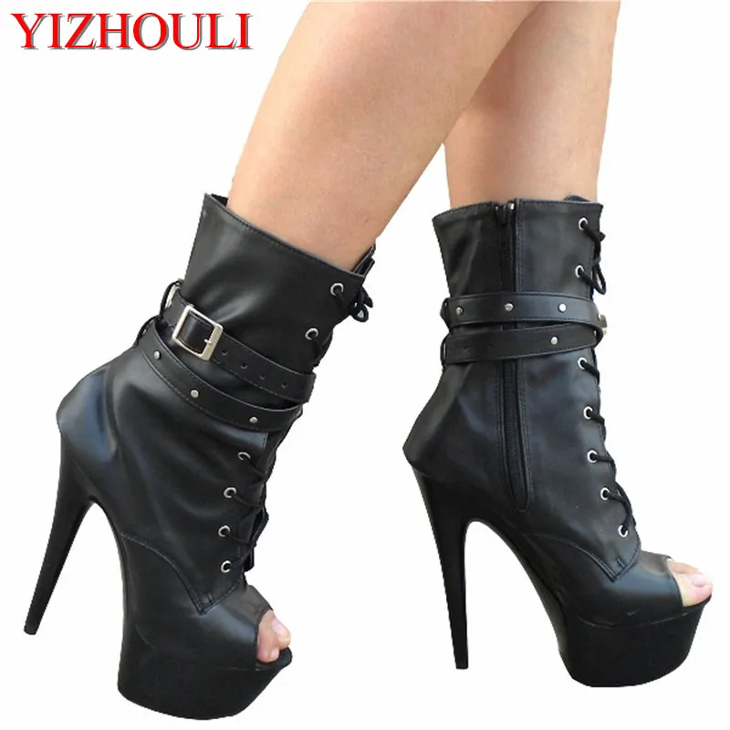 Goede Kopen Ultra dunne hakken laarzen sexy peep teen vrouwen 15 cm mode tijdschrift laarzen zwart Fetish Hoge Hakken 6 inch enkellaarsjes Goedkoop