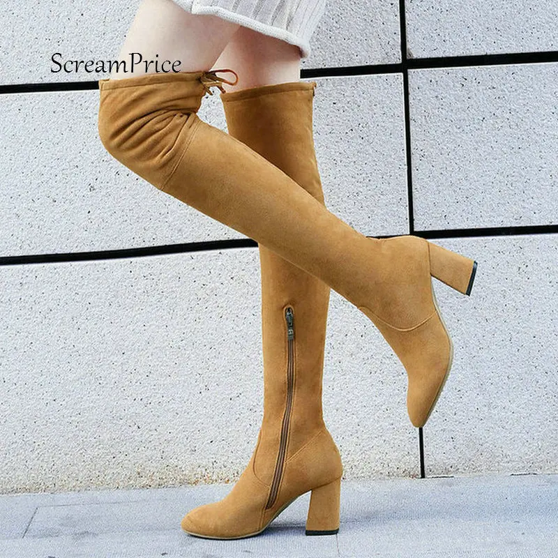 Kopen Goedkoop Vrouwen Faux Su egrave;de Dikke Hoge Hak Over De Knie Laarzen Mode Lace Up Side Rits Elastische Laarzen Zwart Grijs Bruin Online