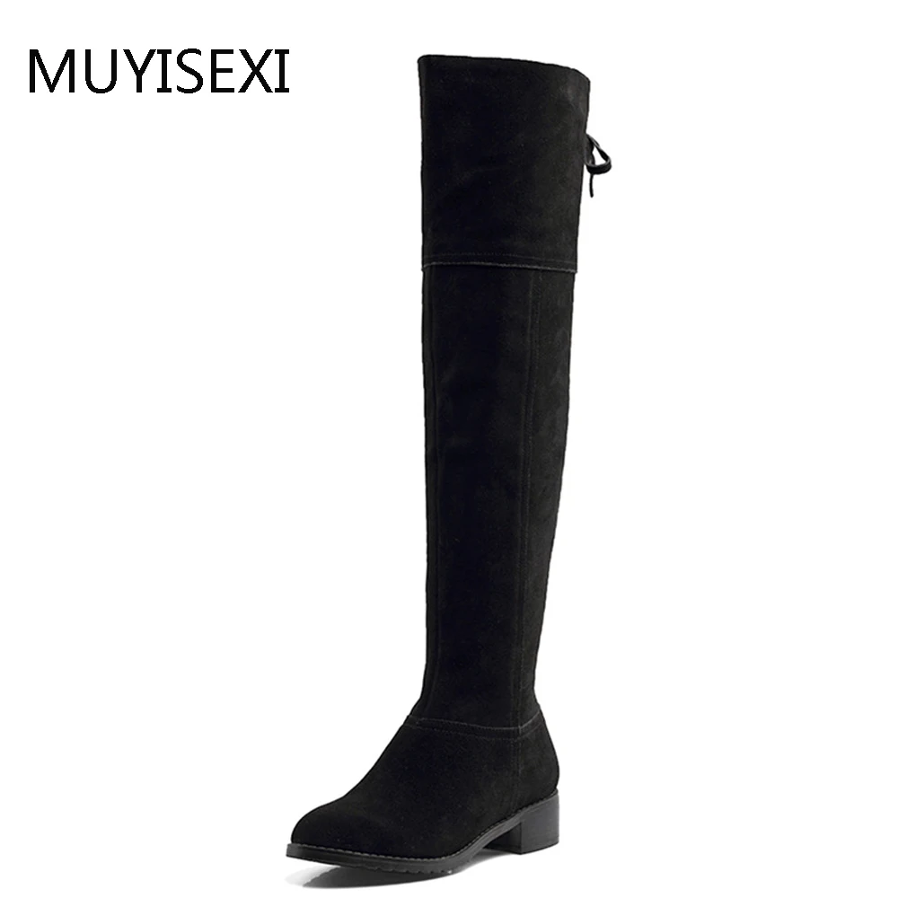 Goede Koop Over de Knie Laarzen Zwart Vol Lederen Ronde Neus Vierkante Hak Vrouwen Winter Schoenen Dij Hoge Laarzen Rits BJ01 MUYISEXI Goedkoop