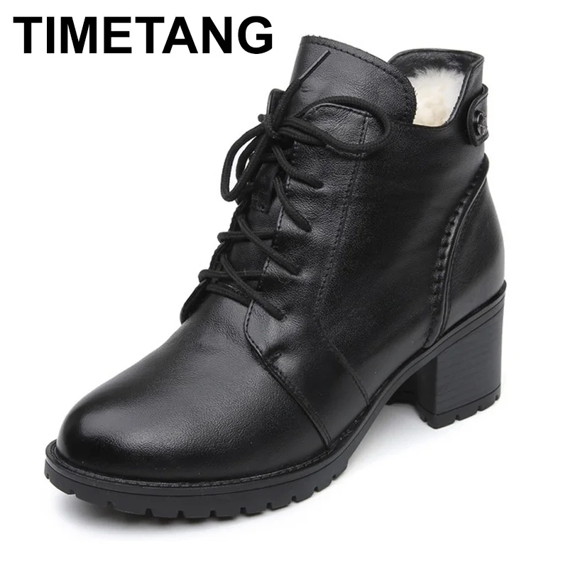 Kopen Goedkoop TIMETANG 2018 Mode Echt Leer Enkellaars Vrouwen Winter Wol Warm Martin Laarzen Zwarte Dikke Hoge Hak Lederen Laars Schoenen Prijs