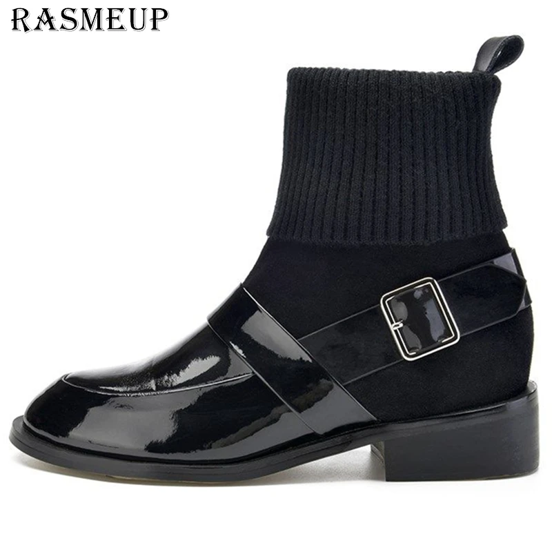 Kopen Goedkoop RASMEUP Lakleer Sok Laarzen Vrouwen 2018 Fashion Elegant Beknopte vrouwen Martin Enkellaars Zwart Comfortabele Stretch Schoenen Prijs