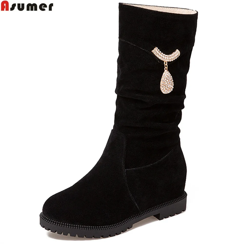 Beste Koop ASUMER mode nieuwe komen vrouwen laarzen zwart rood beige herfst winter dames laarzen hoogte toenemende flock bling mid kuit laarzen Goedkoop